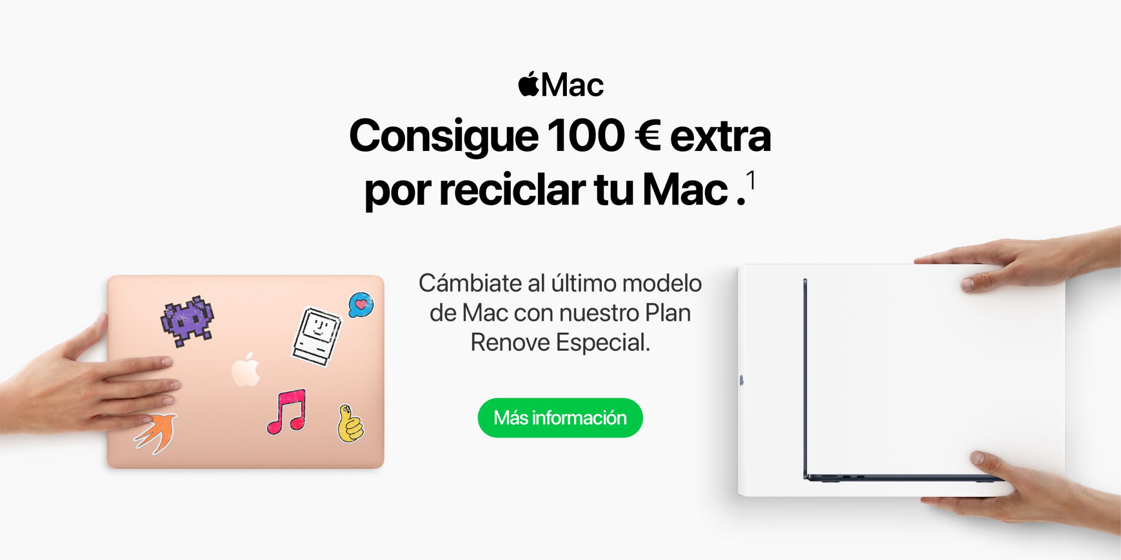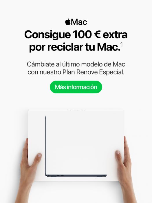 - Oferta Plan Renove Especial válida hasta el 3 de febrero de 2025. Para las compras de Mac consiste en un abono de 100€ extra en la valoración de un antiguo Mac por la compra de un nuevo Mac válido.