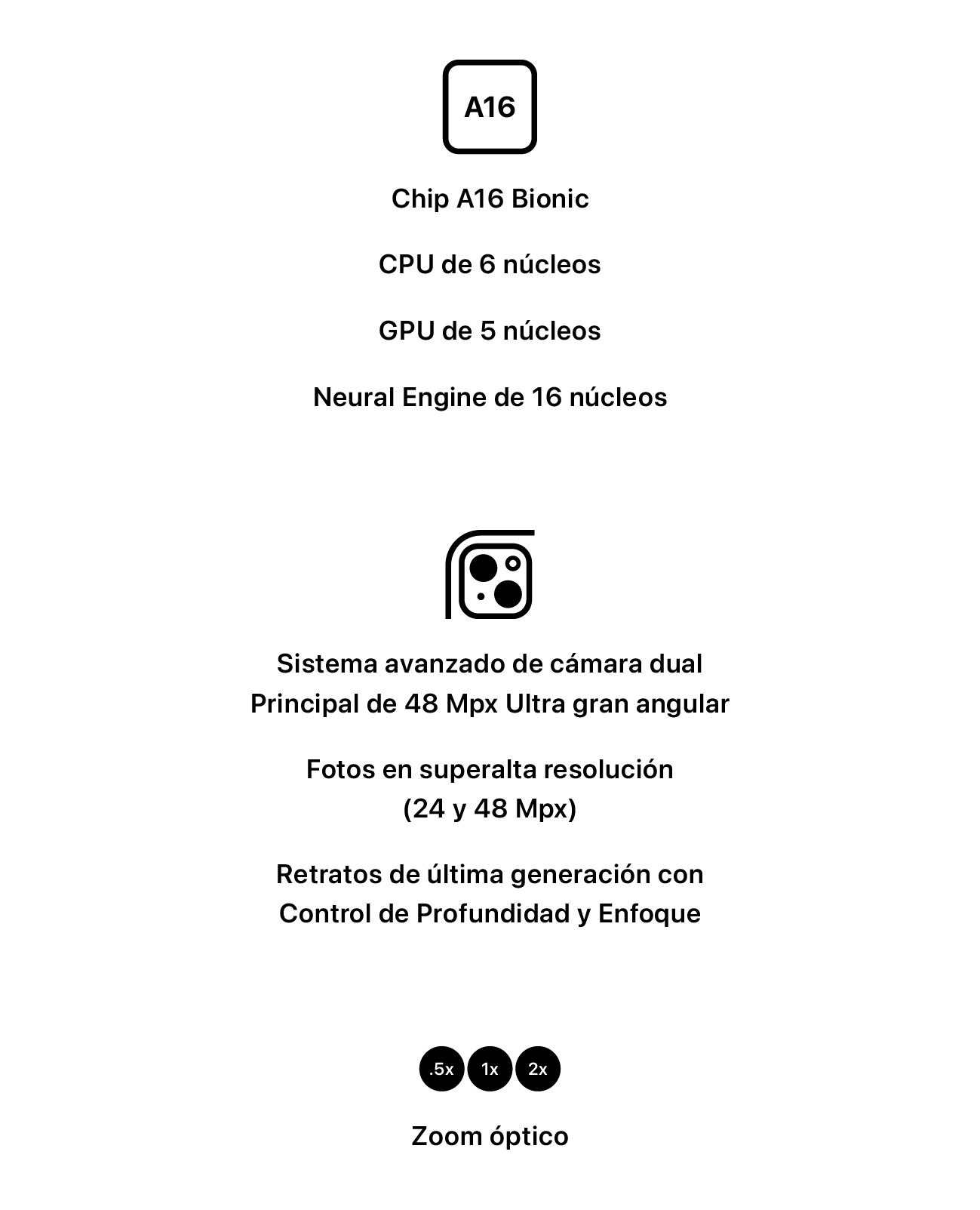 Nueva Cámara Fusion principal de 48 Mpx que te permite grabar en 4K a 120 f/s con Dolby Vision para llevar tus vídeos a otro nivel. Y ojo al ultra gran angular de 48 Mpx, que hace fotos macro con todo lujo de detalles y planos abiertos alucinantes. Con el nuevo Control de Cámara tendrás acceso directo a herramientas como el zoom o la profundidad de campo para que no se te escape ni una buena foto.