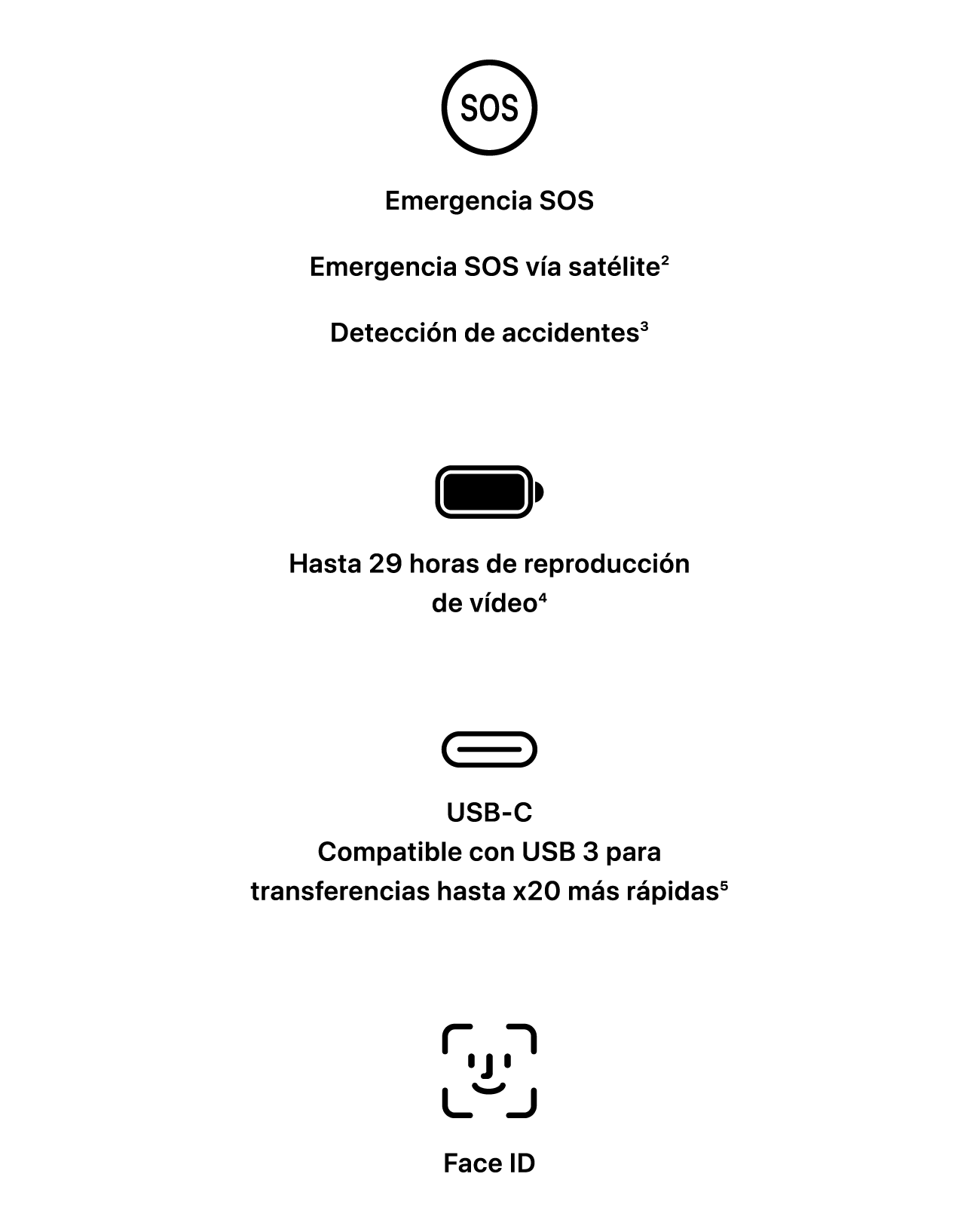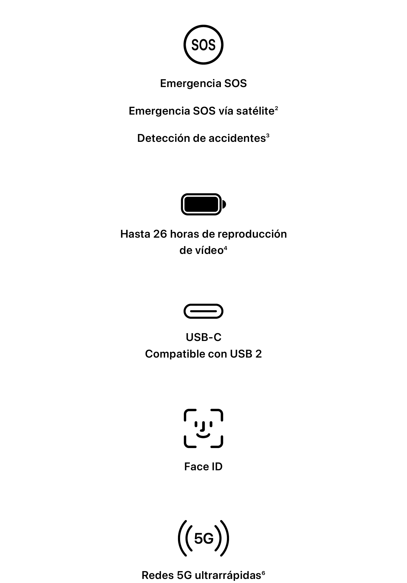 - Servicio gratuito durante dos años con la activación de cualquier modelo de iPhone 14 o iPhone 15. La velocidad de conexión y de respuesta depende de la ubicación, las condiciones del lugar y otros factores. Más información en support.apple.com/es-es/HT213885.