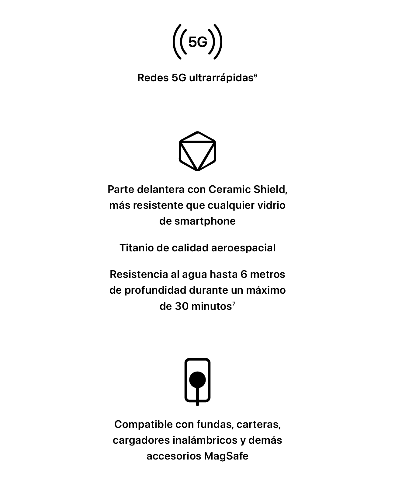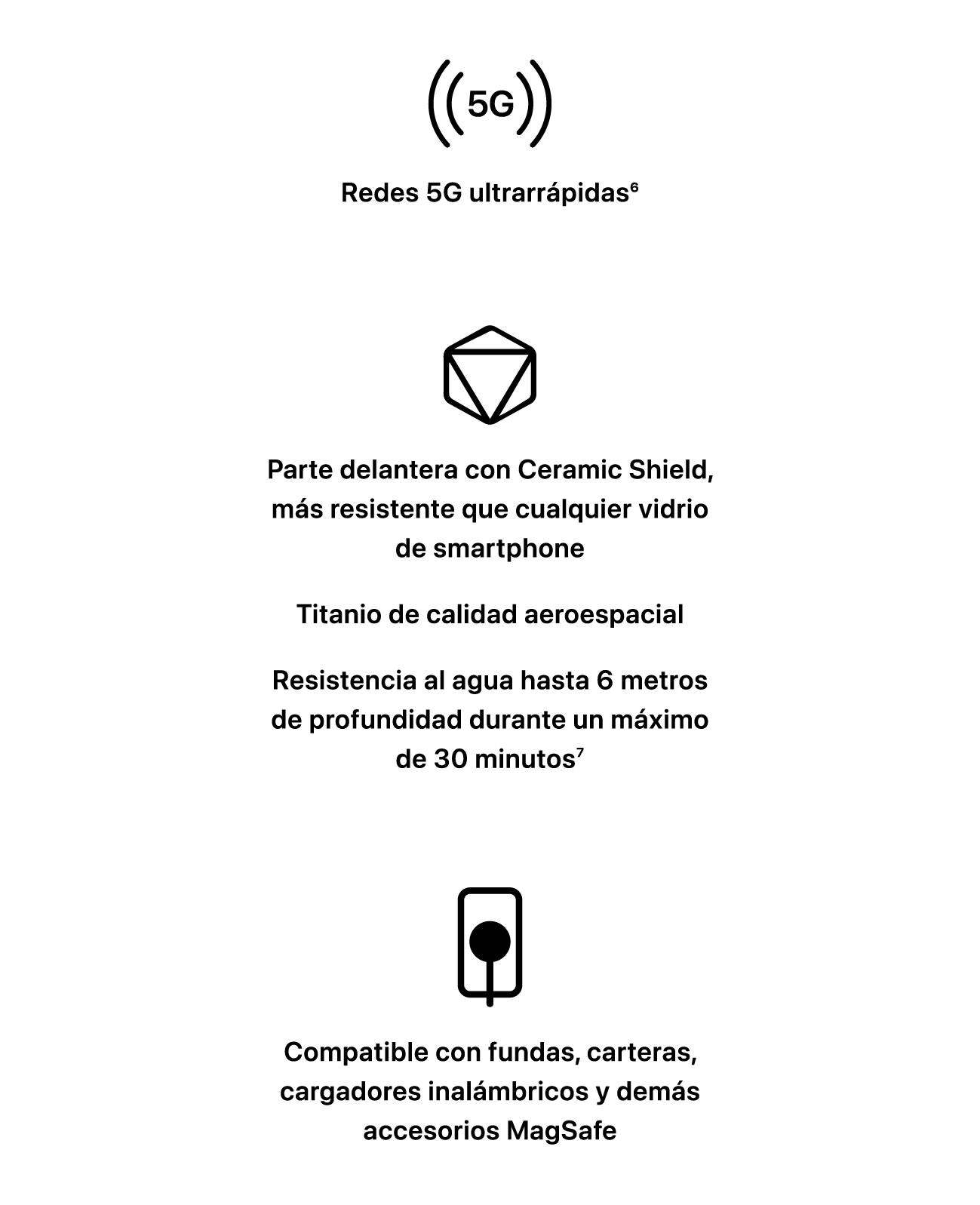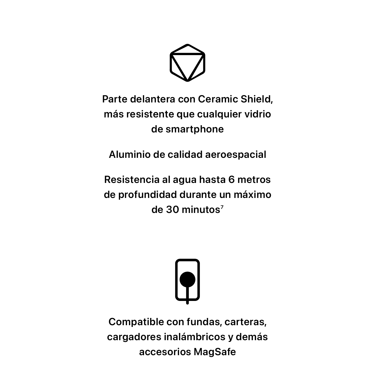 - El iPhone 7, iPhone 7 Plus, iPhone 8, iPhone 8 Plus, iPhone X, iPhone XS, iPhone XS Max, iPhone XR, iPhone SE (2.ª generación), iPhone SE (3.ª generación), iPhone 11 Pro, iPhone 11 Pro Max, iPhone 11, iPhone 12 Pro, iPhone 12 Pro Max, iPhone 12, iPhone 12 mini, iPhone 13 Pro, iPhone 13 Pro Max, iPhone 13, iPhone 13 mini, iPhone 14 Pro, iPhone 14 Pro Max, iPhone 14, iPhone 14 Plus, iPhone 15 Pro, iPhone 15 Pro Max, iPhone 15 y iPhone 15 Plus son resistentes a las salpicaduras, el agua y el polvo. Las pruebas se han realizado bajo control en un laboratorio. El iPhone 12 Pro, iPhone 12 Pro Max, iPhone 12, iPhone 12 mini, iPhone 13 Pro, iPhone 13 Pro Max, iPhone 13, iPhone 13 mini, iPhone 14 Pro, iPhone 14 Pro Max, iPhone 14, iPhone 14 Plus, iPhone 15 Pro, iPhone 15 Pro Max, iPhone 15 y iPhone 15 Plus tienen una calificación IP68 según la norma IEC 60529 (hasta 4 metros de profundidad durante un máximo de 30 minutos). El iPhone XS, iPhone XS Max y iPhone 11 tienen una calificación IP68 según la norma IEC 60529 (hasta 2 metros de profundidad durante un máximo de 30 minutos). El iPhone 7, iPhone 7 Plus, iPhone 8, iPhone 8 Plus, iPhone X, iPhone XR, iPhone SE (2.ª generación) y iPhone SE (3.ª generación) tienen una calificación IP67 según la norma IEC 60529 (hasta 1 metro de profundidad durante un máximo de 30 minutos). La resistencia a las salpicaduras, el agua y el polvo no es permanente y puede disminuir como consecuencia del uso habitual. No intentes cargar el iPhone si está mojado. Consulta el manual de uso antes de limpiarlo o secarlo. La garantía no cubre los daños producidos por líquidos.