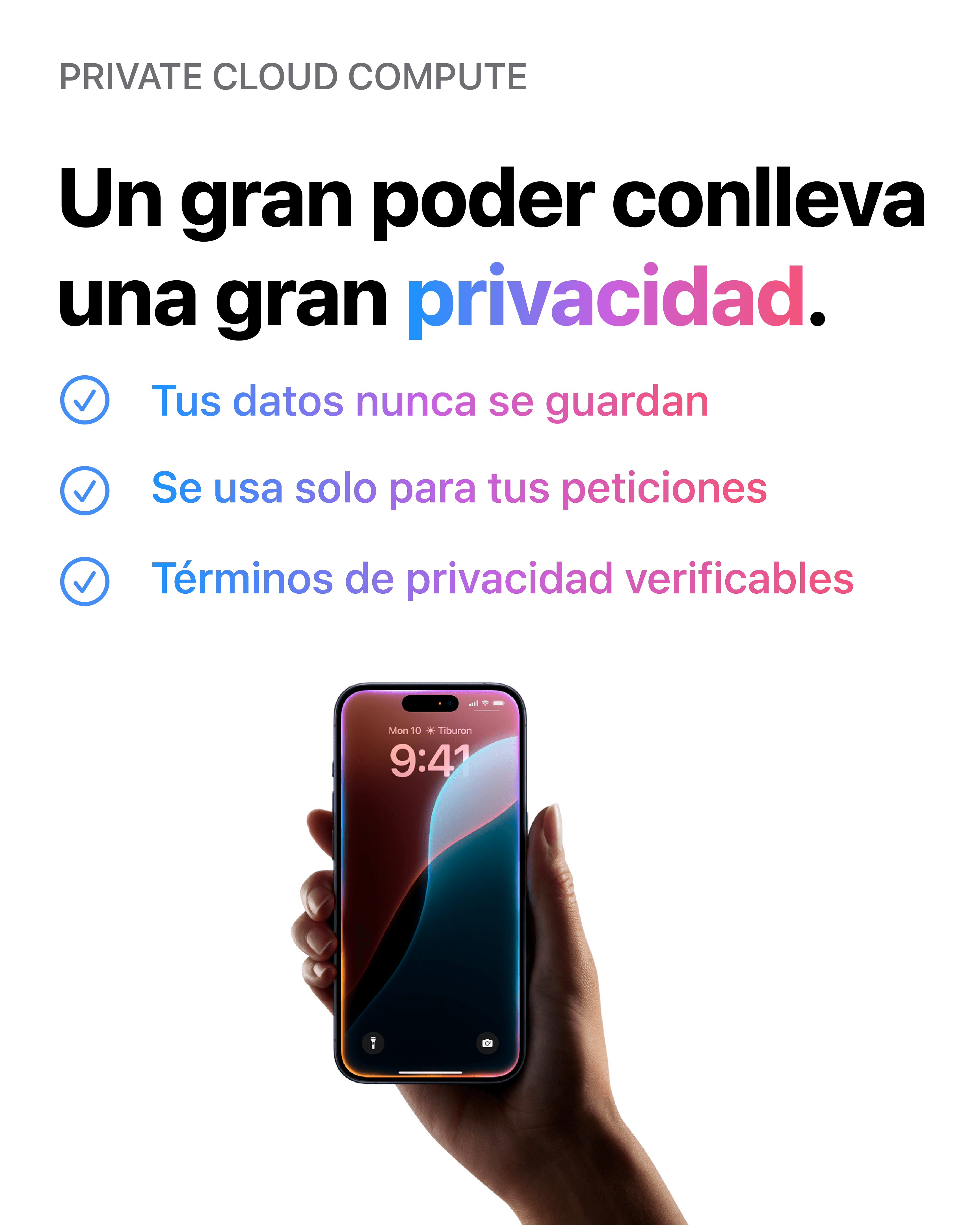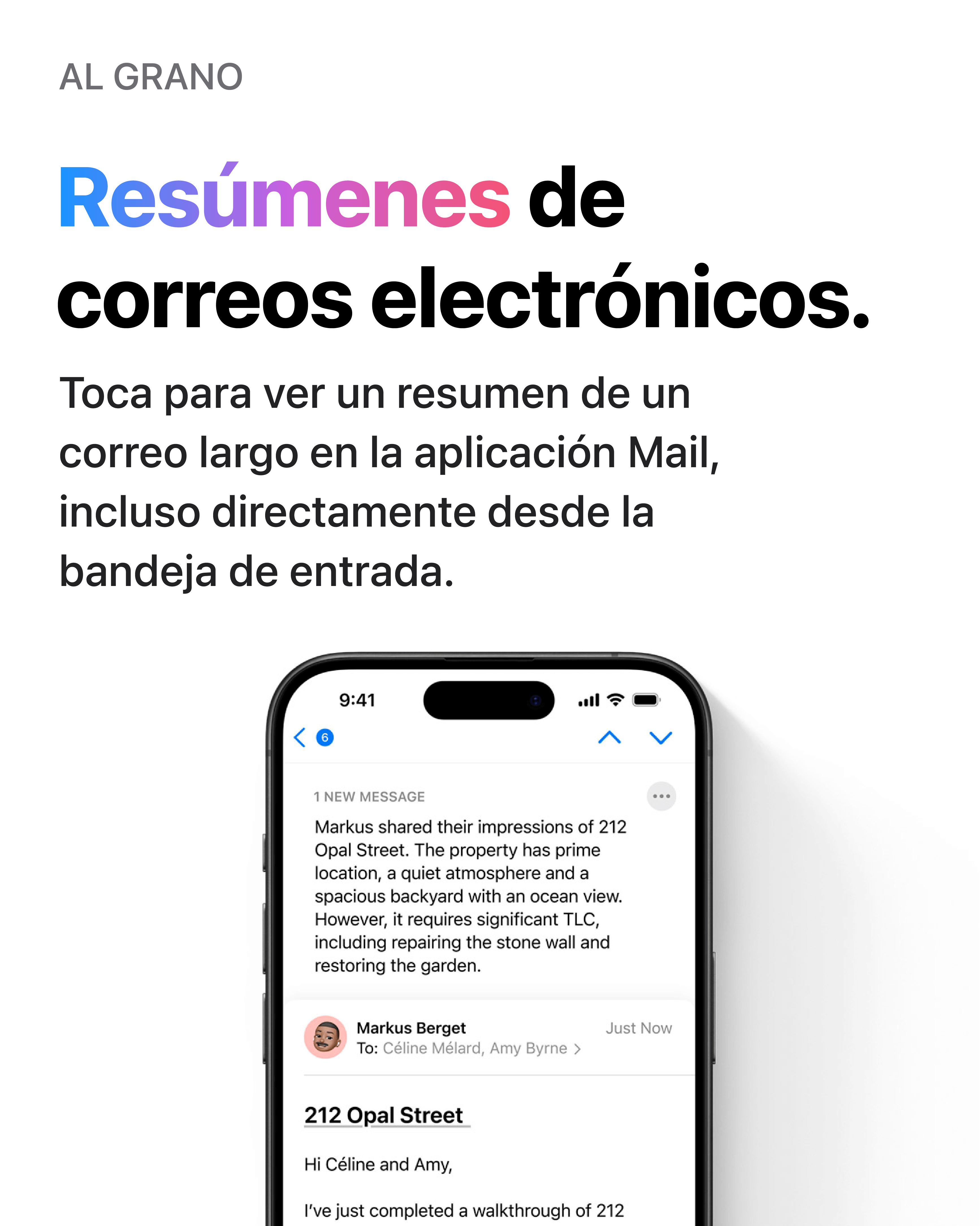 *Apple Intelligence está disponible en versión beta como actualización de iOS 18, iPadOS 18 y macOS Sequoia para todos los modelos de iPhone 16, el iPhone 15 Pro, el iPhone 15 Pro Max, el iPad mini (A17 Pro) y los modelos de iPad y Mac con chip M1 o posterior con el idioma de Siri y el dispositivo configurados en alemán, chino (simplificado), coreano, español, francés, inglés (de Australia, Canadá, Estados Unidos, India, Irlanda, Nueva Zelanda, Reino Unido, Singapur o Sudáfrica), italiano, japonés o portugués (de Brasil). A lo largo del año se irán sumando otras plataformas e idiomas, como vietnamita. Algunas prestaciones no están disponibles en todos los países o idiomas.