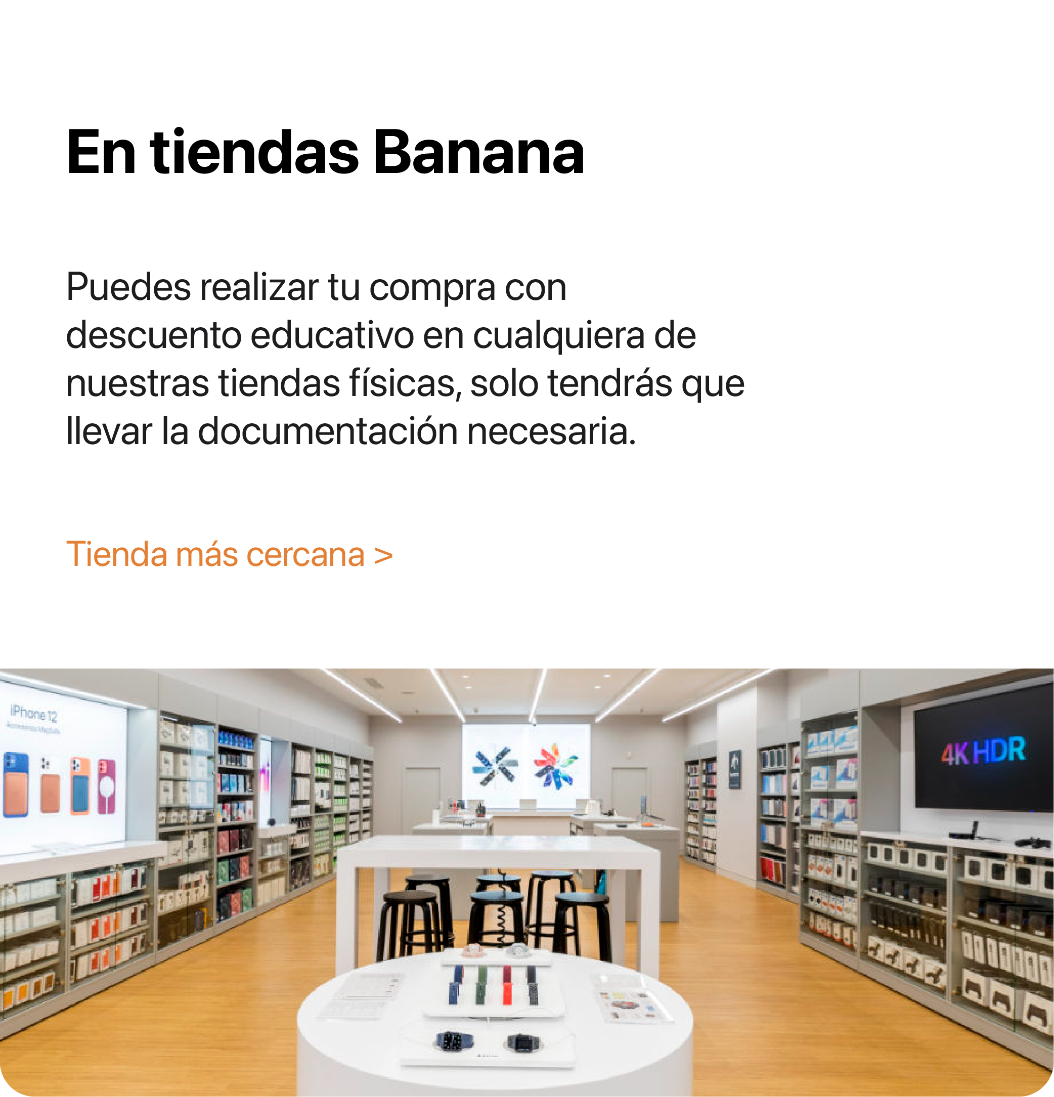 En Banana, ofrecemos a profesores y estudiantes facilidades y descuentos especiales en la compra de iMac, Mac Mini, MacBook Air, MacBook Pro y la familia iPad completa.
