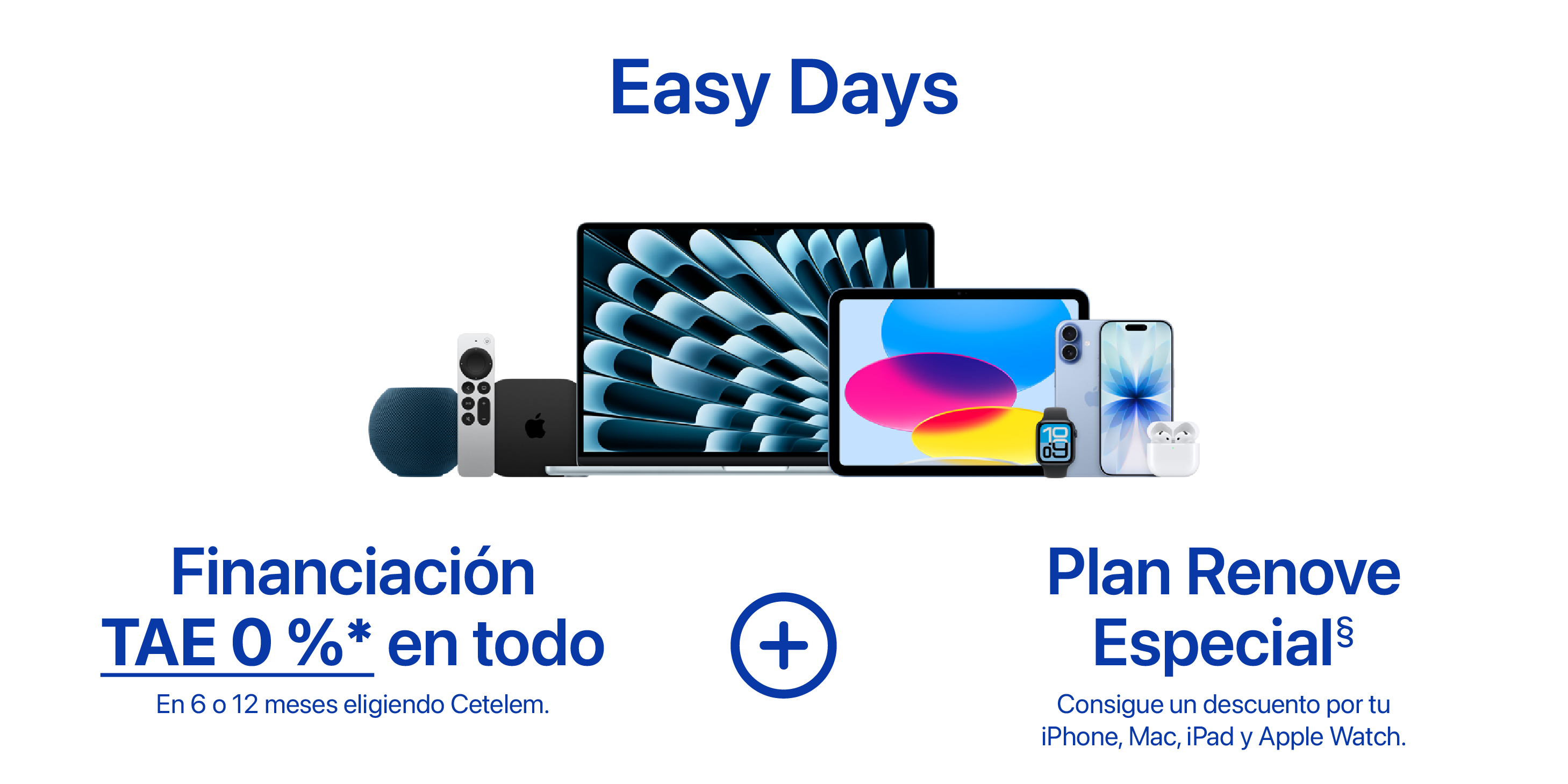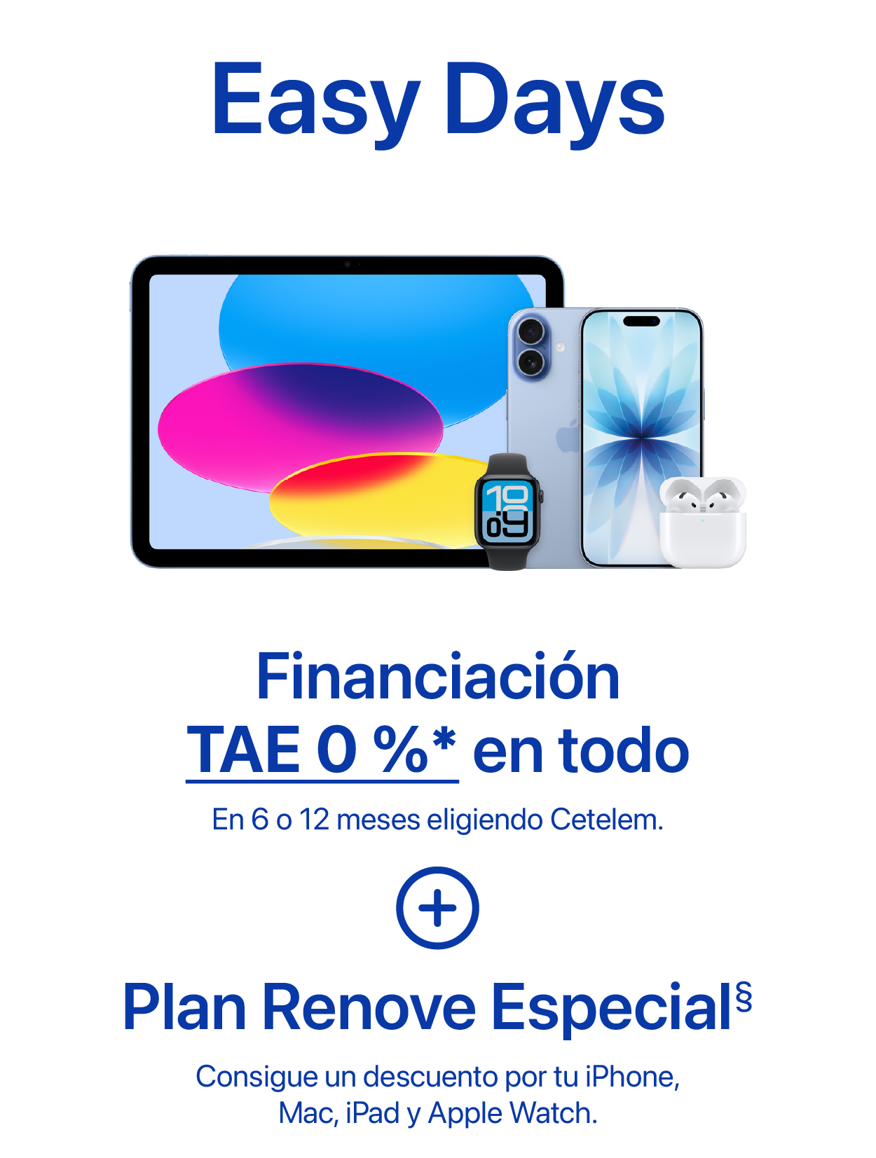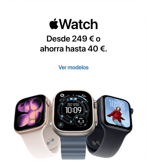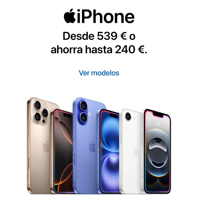 § Oferta Plan Renove Especial válida hasta el 3 de marzo de 2025. Para las compras de iPhone consiste en un abono de 60€ extra en la valoración de un antiguo iPhone valorado en más de 70€ por la compra de un nuevo iPhone válido. Para las compras de Mac consiste en un abono de 100€ extra en la valoración de un antiguo Mac valorado en más de 1€ por la compra de un nuevo Mac válido. Para las compras de iPad consiste en un abono de 50€ extra en la valoración de un antiguo iPad valorado en más de 1€ por la compra de un nuevo iPad válido. Para las compras de Apple Watch consiste en un abono de 50€ extra en la valoración de un antiguo Apple Watch valorado en más de 1€ por la compra de un nuevo Apple Watch válido. Consulta todas las condiciones de renove tocando: aquí.