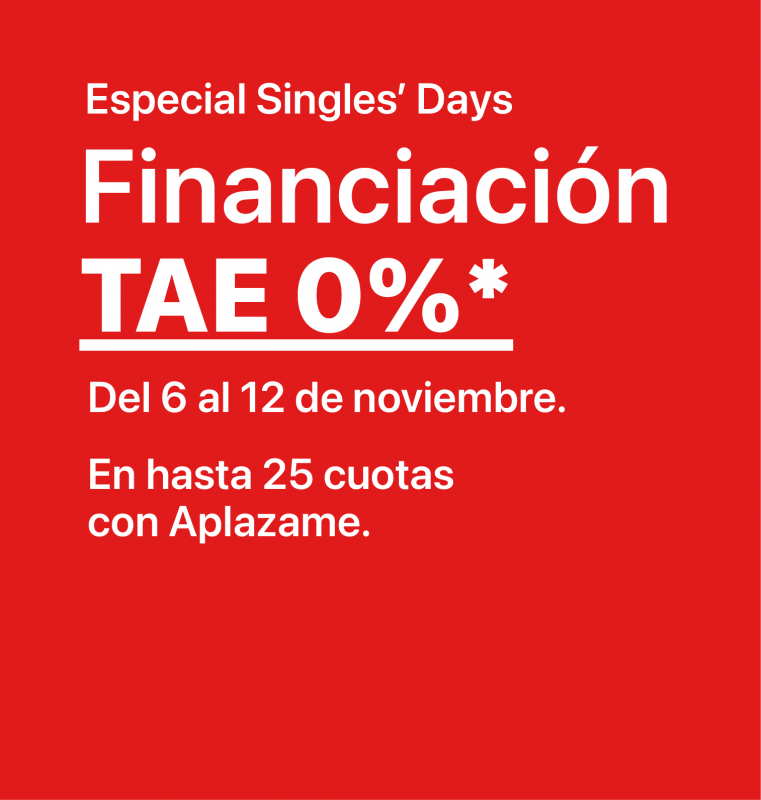 * Ejemplo de financiación con APLAZAME para una compra de 1.000,00€ a 12 meses y que comienza a pagar a los 30 días de la solicitud. Se solicita una entrada de 76,96€ que el usuario debe pagar a través de su tarjeta en el momento en que realiza la operación. El importe a financiar es la diferencia entre el valor de la cesta (1.000,00€) y la entrada (76,96€): 923,04€. Se solicitan 12 mensualidades de 76,92€. Comisión de apertura: 0€. TIN 0,00%; TAE 0,00%. Importe total adeudado: 923,04€. PVP 1.000,00€. Precio total a plazos 1.000,00€. Sujeto a la aprobación por parte de APLAZAME (WiZink Bank, S.A.U.).