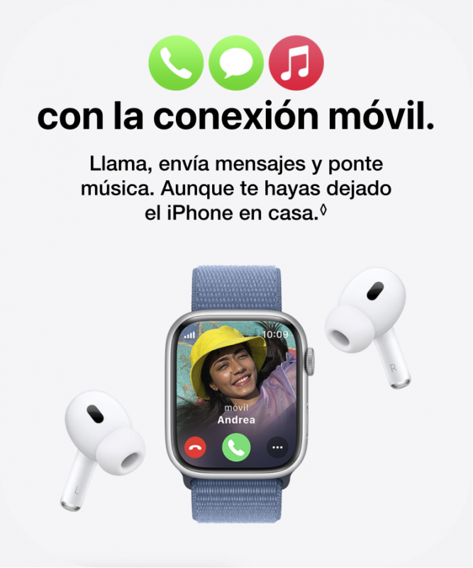 Redes móviles e inalámbricas: El servicio de telefonía móvil requiere un plan de datos móviles. Ponte en contacto con tu operador para obtener más información. La conexión puede variar según la disponibilidad de las redes. Consulta los operadores de telefonía móvil participantes y los requisitos en apple.com/es/watch/cellular. Más instrucciones de configuración en support.apple.com/es-es/HT207578.