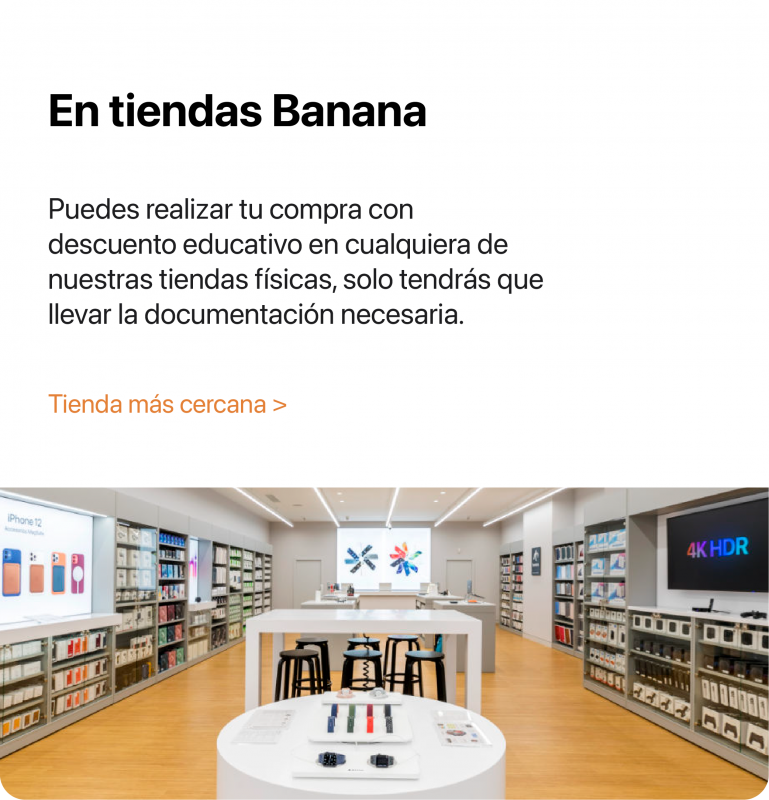En Banana, ofrecemos a profesores y estudiantes facilidades y descuentos especiales en la compra de iMac, Mac Mini, MacBook Air, MacBook Pro y la familia iPad completa.